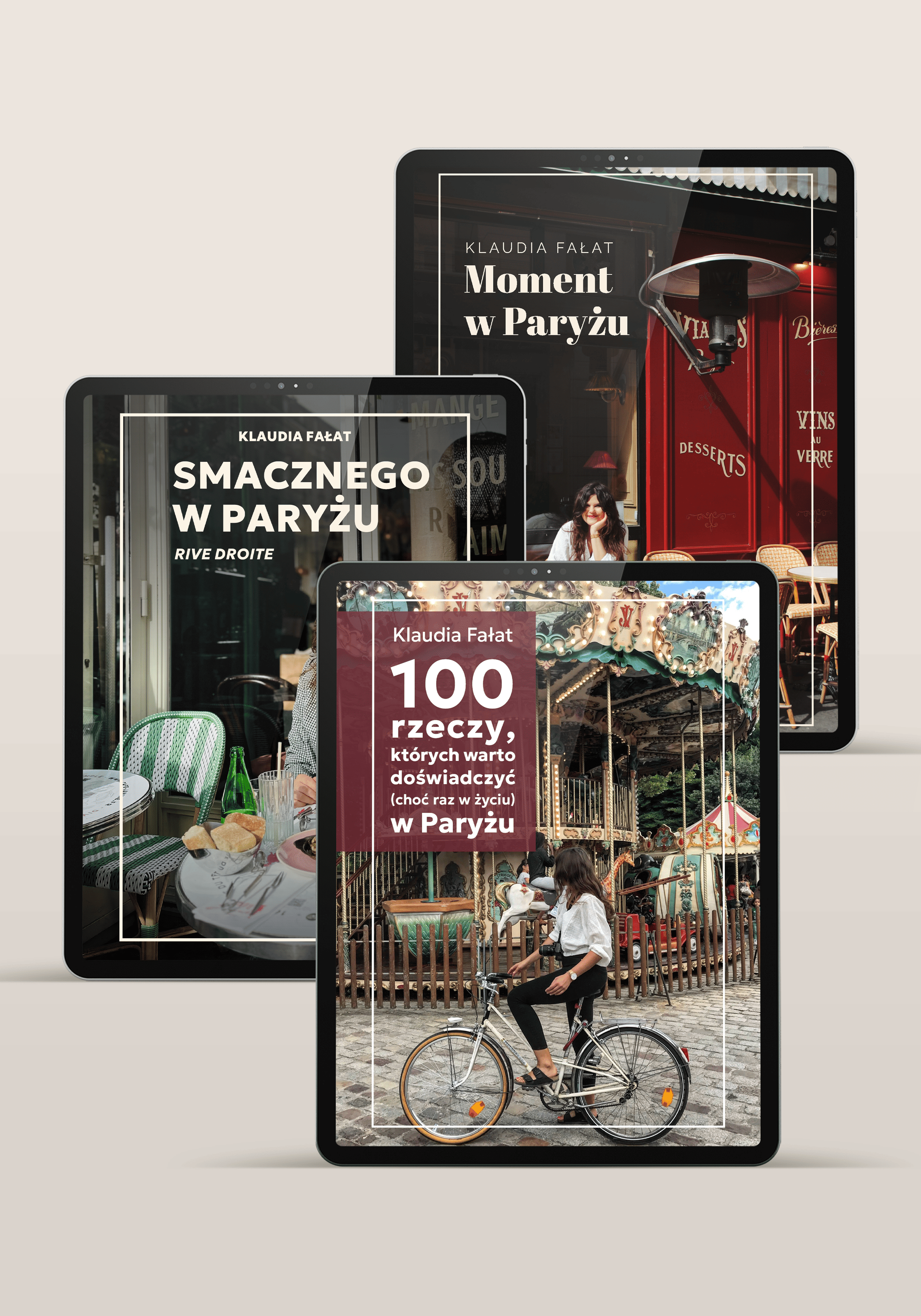 Moje trzy przewodniki: “Moment w Paryżu”, “100 rzeczy, których warto doświadczyć (choć raz w życiu) w Paryżu” oraz “Smacznego w Paryżu” w formie e-booków. W jednym znajdziesz gotowe trasy spacerowe na 3 dni, w drugim 100 pomysłów na spędzenie czasu w Paryżu tak, żeby podróż była niezapomniana, wyjątkowa, z efektem WOW, a w trzecim listę 50 restauracji, w których polecam Ci zjeść.