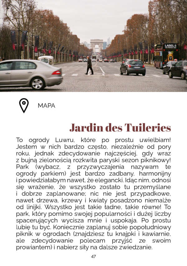 To nie tylko lista 113 miejsc – ułożyłam je wszystkie po sobie w logiczną całość. Zwiedzasz jak ze mną za rękę. Idziesz przez miasto i… wiesz, na co patrzysz. Pokażę Ci najpopularniejsze atrakcje (wiem, że bez nich Paryż to nie Paryż), ale przy okazji zobaczysz wszystko to, co pokazałabym Ci podczas wspólnego zwiedzania. Z tym przewodnikiem nie musisz nic planować – wszystko zrobiłam za Ciebie. Otwierasz, czytasz, przechodzisz do map, idziesz.